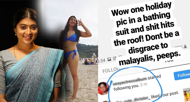 കടൽത്തീരത്ത് നീല ബിക്കിനി അണിഞ്ഞു നിൽക്കുന്ന ചിത്രം താരം പങ്കു വച്ചതോടെ അശ്ലീലച്ചുവയുള്ള കമന്റുകളും പ്രതികരണങ്ങളും ഒരുപാട് എത്തിത്തുടങ്ങി. പലതും മലയാളികളുടെ അക്കൗണ്ടുകളിൽ നിന്നു തന്നെ. ഇൗ ചിത്രം പുറത്തു വന്നതോടെ നടിയെ സമൂഹമാധ്യമത്തിൽ ഫോളോ ചെയ്യാൻ ആഗ്രഹിക്കുന്നവരുടെ എണ്ണവും ക്രമാതീതമായി വർധിച്ചു. അശ്ലീലം അതിരു കടന്നതോടെ ശക്തമായ പ്രതികരണവുമായി നടി രംഗത്തു വന്നു. ‘ബാത്തിങ് സ്യൂട്ടിൽ നിൽക്കുന്ന ഒരു അവധിക്കാലചിത്രം പങ്കു വച്ചാൽ ഇതാണോ അവസ്ഥ ? വെറുതെ മലയാളികൾക്ക് നാണക്കേടുണ്ടാക്കരുത്.’ നടി പറഞ്ഞു. ഇതിനു പിന്നാലെ ഇൗ ചിത്രം താരം നീക്കം ചെയ്യുകയും ചെയ്തു.