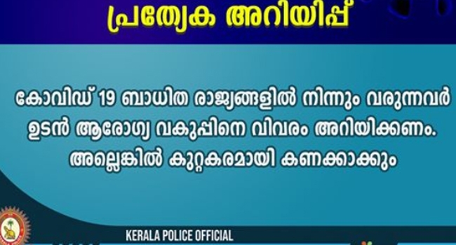ശക്തമായ നിരീക്ഷണം നടത്താനാണ് ആരോഗ്യ വകുപ്പ് ശ്രമിക്കുന്നതെന്നും കേരള പൊലീസ് ഫേയ്സ്ബുക്ക് പേജിലൂടെ അറിയിച്ചു.