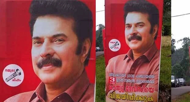തീക്കോയി ഗ്രാമപഞ്ചായത്തിലെ മൂന്നാം വാര്ഡില് മമ്മൂട്ടി ഇടത് സ്വതന്ത്ര്യ സ്ഥാനാര്ത്ഥിയായി മത്സരിക്കുന്നു. ടോര്ച്ച് ചിഹ്നത്തിലാണ് മമ്മൂട്ടി മത്സരിക്കുന്നത്. തിരഞ്ഞെടുപ്പിനായുള്ള ഫ്ലക്സ് ബോര്ഡുകള് വാര്ഡില് നിരന്നുകഴിഞ്ഞു. മാത്യു ദേവസിയെ വിജയിപ്പിക്കുക എന്ന അടിക്കുറിപ്പോടെയാണ് ബോര്ഡുകള് സ്ഥാപിച്ചിരിക്കുന്നത്.
