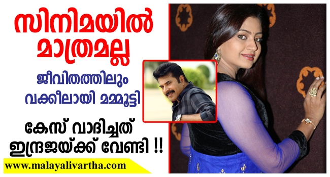 സിനിമയിലല്ലാതെ യഥാര്ത്ഥ ജീവിതത്തിലും വക്കീലാവാന് മമ്മൂട്ടിക്ക് അവസരം ലഭിച്ചത് ഇന്ദ്രജയിലൂടെയാണ്. സഹപ്രവര്ത്തകയ്ക്ക് വേണ്ടി വാദം നടത്തിയതിലൂടെ അഭിനയത്തിനുമപ്പുറത്ത് ജീവിതത്തിലും വക്കീലാവാന് താരത്തിന് കഴിഞ്ഞു. സിനിമയ്ക്കും അപ്പുറത്ത് ജീവിതത്തിലും വാദിച്ച് ജയിക്കാന് കഴിയുമെന്ന് മമ്മൂട്ടി തെളിയിച്ച സംഭവം കൂടിയായിരുന്നു ഇന്ദ്രജയുടെ കേസ്. അക്കാലത്ത് സിനിമയില് തിളങ്ങി നിന്നിരുന്ന താരമായ ഇന്ദ്രജയും നിര്മ്മാതാവും തമ്മിലുള്ള കേസാണ് താരം വാദിച്ചത്.