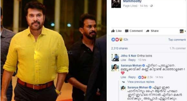 ചിത്രത്തിന് താഴെ നടി ശരണ്യ മോഹന് പോസ്റ്റ് ചെയ്ത ഒരു കമന്റ് ആണ് ഇപ്പോള് ആരാധകരുടെ ചര്ച്ച. 'എന്റെ പടച്ചോനെ . മമ്മൂക്കയ്ക്ക് കണ്ണ് കിട്ടാണ്ട് കാത്തോളണേ ! ' ഇങ്ങനെയായിരുന്നു ശരണ്യയുടെ കമന്റ്. 2500 ഓളം ലൈക്സ് ആണ് ഈ കമന്റിന് ലഭിച്ചതും, കൂടാതെ അഞ്ഞൂറില് പരം മറുപടിയും കമന്റിന് താഴെയായി എത്തി.