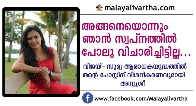 വിജയ് ആരാധകരെ വേദനിപ്പിക്കാനോ വിജയിയെ ഇകഴ്ത്തി കാണിക്കാനോ ഞാന് ശ്രമിച്ചിട്ടില്ല:അനുശ്രീ