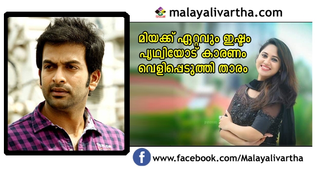 ഒന്നിച്ച് അഭിനയിച്ച നടന്മാരില് തനിക്ക് ഏറ്റവും ഇഷ്ടം പൃഥ്വിരാജിനെയാണെന്ന് നടി മിയ