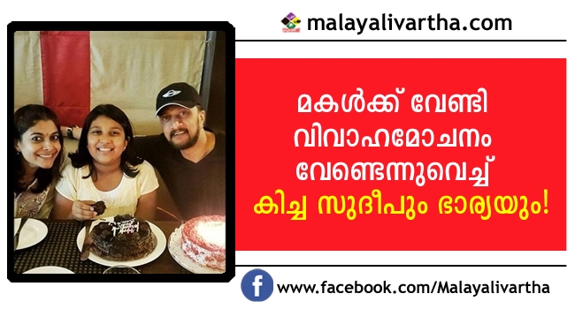താരങ്ങളുടെ വിവാഹമോചനം വാര്ത്തയല്ലാതാകുന്ന കാലത്ത് വിവാഹമോചനത്തിനോട് നോ പറഞ്ഞ് വാര്ത്തയില് ഇടം നേടിയിരിക്കുകയാണ് കന്നടതെലുങ്ക് സൂപ്പര്താരം കിച്ച സുദീപും ഭാര്യ പ്രിയയും. മകള് സന്വിയുടെ ഭാവിയെ കരുതിയാണ് ഇരുവരും ഒരുമിക്കാന് തീരുമാനമെടുത്തത്.