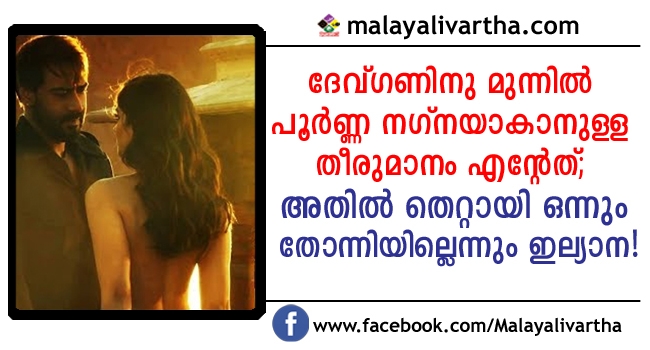 ആ തീരുമാനം തന്റേത് തന്നെയായിരുന്നു എന്ന് ഇപ്പോള് വെളിപ്പെടുത്തിയിരിക്കുകയാണ് ഇല്യാന. 'എനിക്കും അജയ് ദേവ്ഗണിനുമിടയിലുള്ള കെമിസ്ട്രി നല്ല രീതിയില് സിനിമയില് നടപ്പിലാക്കാന് സാധിച്ചിട്ടുണ്ട്. അജയ്യുടെ കണ്ണുകള് പോലും ഒരുപാട് കഥകള് പറയും. അജയ്ക്കൊപ്പം അഭിനയിക്കുമ്പോള് അറിയാതെ നമ്മളും ആ കഥാപാത്രമായി മാറിപ്പോവും-താരം പറയുന്നു.