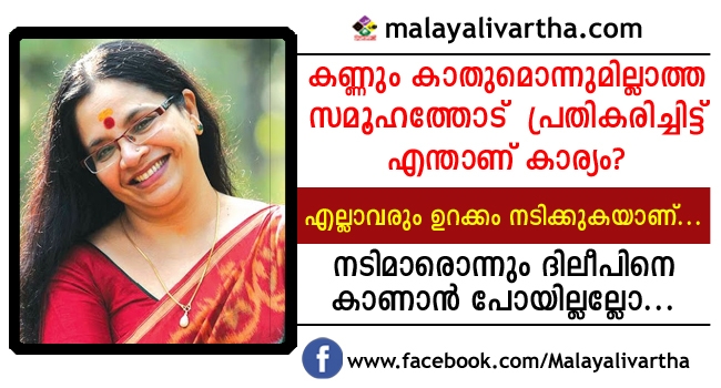 ദിലീപിനെ കാണാൻ പോയവരൊന്നും ആ പെൺകുട്ടിയെ കാണാൻ പോകാതിരുന്നതെന്തുകൊണ്ടാണ്?. ദിലീപ് തെറ്റ് ചെയ്തിട്ടില്ലെന്ന് പറയുന്നവർ ആ പെൺകുട്ടി എന്ത് തെറ്റ് ചെയ്തിട്ടാണ് അവളെ കാണാനും ആശ്വസിപ്പിക്കാനും പോകാതിരിക്കുന്നത്. അവളുടെ അടുത്ത് ഒാണക്കോടിയുമായി പോയി നിന്നോടൊപ്പം ഞങ്ങളുണ്ട് എന്ന് പറഞ്ഞുകൂടെ.