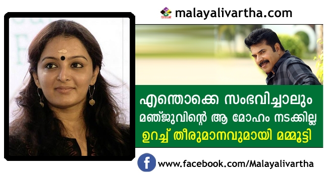 തനിക്കും മമ്മൂട്ടിക്കും ഒരുമിച്ചഭിനയിക്കാന് പറ്റുന്ന സിനിമയുമായി ആരെങ്കിലും സമീപിക്കണമെന്നും ആഗ്രഹമുണ്ട്. ആരെങ്കിലും അങ്ങനെയൊരു സിനിമ സൃഷ്ടിക്കട്ടെയെന്നും കൂടെ അഭിനയിക്കാനുള്ള അനുവാദം മമ്മൂട്ടി നല്കട്ടെയെന്നും മഞ്ജു ആഗ്രഹം പ്രകടിപ്പിച്ചിരുന്നു. ഈ അഭിമുഖത്തെക്കുറിച്ച് തന്നോട് സൂചിപ്പിച്ച സുഹൃത്തുക്കളോടാണ് താന് ഇപ്പോള് ആ കാര്യത്തെ കുറിച്ച് ആലോചിക്കുന്നില്ല എന്ന മറുപടി മമ്മുട്ടി പറഞ്ഞതെന്നാണ് അറിയുന്നത്.
