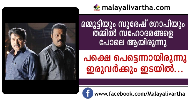 മലയാളത്തിന്റെ മെഗാസ്റ്റാര് മമ്മൂട്ടിയും സൂപ്പര്സാറ്റാറും എംപിയുമായ സുരേഷ് ഗോപിയും തമ്മില് ഇപ്പോള് നല്ല സൗഹൃദത്തിലല്ല എന്നാണ് റിപ്പോര്ട്ടുകള്. സത്യത്തില് എന്തിനാണ് മമ്മൂട്ടിയുമായി സുരേഷ് ഗോപി അകന്നത്. എന്നാല് സത്യത്തില് സംഭവിച്ചത് ഇതാണ്...