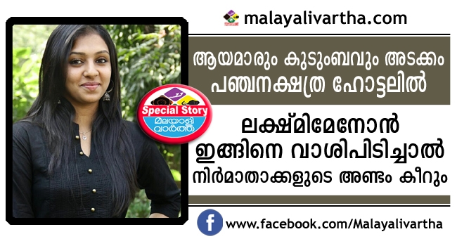 ലക്ഷ്മിമേനോന് പഞ്ചനക്ഷത്ര ഹോട്ടലിലും അമ്മയ്ക്കും അപ്പൂപ്പനും അമ്മൂമ്മയ്ക്കും ത്രീസ്റ്റാര് ഹോട്ടലിലും പ്രൊഡക്ഷന് അധികൃതര് താമസം ഒരുക്കി. ഇതറിഞ്ഞ താരം കലിതുള്ളി. താനിവിടെ പഞ്ചനക്ഷത്രത്തില് കിടന്ന് സുഖിക്കുമ്പോള് കുടുംബാംഗങ്ങള് മൂന്ന് നക്ഷത്രത്തില് കഴിയുന്നത് തനിക്ക് നാണക്കേടാണെന്നും അവരെയും തന്റെ രണ്ട് ആയമാരേയും താന് താമസിക്കുന്ന ഹോട്ടലില് തന്റെ മുറിക്കടുത്ത് താമസിപ്പിക്കണമെന്ന് വാശിപിടിച്ചു. ഷൂട്ടിംഗ് തുടങ്ങാന് ഏതാനും ദിവസമേ ഉള്ളൂ, മറ്റ് നായികമാരെ തപ്പിയെടുക്കാന് പ്രയാസമാണ്. ഇത് മനസിലാക്കിയ നിര്മാതാവ് എല്ലാ പരിവാരങ്ങളെയും പഞ്ചനക്ഷത്രത്തിലേക്ക് ആനയിച്ചു.