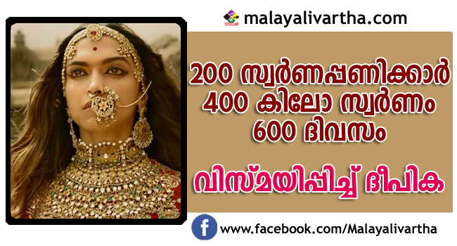സര്വാഭരണവിഭൂഷിതയായി ദീപിക പദുകോണ് ഒരുങ്ങി നില്ക്കുന്നതിന്റെ പുറകില് വിസ്മയ പ്രവര്ത്തനമാണ്. ബോളിവുഡ് സംവിധായകന് സഞ്ജയ് ലീല ബന്സാലിയാണ് ദീപികയെ ഇങ്ങനെ പൊന്ന് കൊണ്ട് മൂടിയത്. എന്തു കാര്യം ചെയ്താലും അതു പൂര്ണമായും കൃത്യമായും വ്യക്തമായും മാത്രമേ ചെയ്യൂ. പ്രേക്ഷകര് ആകാംക്ഷയോടെ കാത്തിരിക്കുന്ന പദ്മാവതി എന്ന ചിത്രത്തിന്റെ കാര്യവും അങ്ങനെതന്നെ.