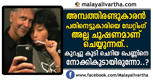 ബോളിവുഡ് ചലച്ചിത്ര മേഖലയിലെ നടനും മോഡലുമാണ് മിലിന്ദ് സോമൻ. സിനിമയിൽ അത്ര പ്രേക്ഷകശ്രദ്ധ നേടാൻ കഴിഞ്ഞില്ലെങ്കിലും ഇപ്പോൾ താരം സമൂഹമാധ്യമങ്ങളിൽ നിറഞ്ഞുനിൽക്കുകയാണ്. തന്റെ കാമുകിയുമായുള്ള സെൽഫി ചിത്രങ്ങൾ സമൂഹമാധ്യമങ്ങളിൽ അദ്ദേഹം പങ്കുവച്ചിരുന്നു.