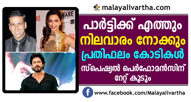 നടന് അക്ഷയ് കുമാറിന് ഏത് ആഘോഷത്തില് പങ്കെടുക്കുന്നതിനും പ്രതിഫലം 2 കോടി രൂപയാണ്. ബോളിവുഡ് നടിമാരും ഒട്ടും മോശമല്ല. പ്രിയങ്കയും ദീപികയും വാങ്ങുന്നത് ഒരു കോടി രൂപയാണ്. തുക ഒരു കോടിയാണ് എങ്കിലും പാര്ട്ടിയുടെ നിലവാരമാണു ദീപികയ്ക്ക് കൂടുതല് പ്രധാനം.