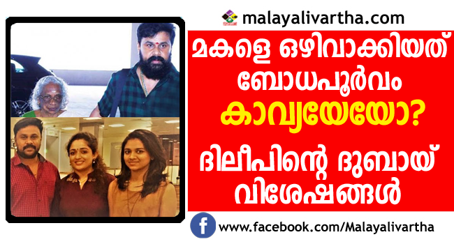 ദിലീപിന്റെ ദുബായ് യാത്രയില് എല്ലാവരും പ്രതീക്ഷിച്ചതല്ല നടന്നത്. കാവ്യയേയും മകള് മീനാക്ഷിയേയും പ്രതീക്ഷിച്ചിരുന്ന സകലരേയും അമ്പരപ്പിച്ച് ദിലീപെത്തിയത് അമ്മയുടെ കൈയ്യും പിടിച്ചായിരുന്നു. മീനാക്ഷിയ്ക്ക് പരീക്ഷയായതിനാലാണ് കൊണ്ടു വരാത്തതെന്നാണ് പറയുന്നത്. അതേ സമയം കാവ്യയെ ഒഴിവാക്കിയതായും സൂചനയുണ്ട്. ഇതിനിടെ കാവ്യ ഗര്ഭിണിയായതിനാലാണ് ദുബായ് യാത്ര വേണ്ടെന്ന് ഉപദേശിച്ചതെന്നും സിനിമാ വൃത്തങ്ങള് പറയുന്നു. എന്നാല് കാവ്യ ദുബായില് എത്തുമെന്നും പറയുന്നു.