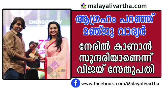 സേതുപതിയോടുള്ള ആരാധന വെളിപ്പെടുത്തി മഞ്ജു വാര്യർ; പുരസ്കാര വേദിയില് വെച്ച് മഞ്ജുവിനെ ഞെട്ടിച്ച് സേതുപതി