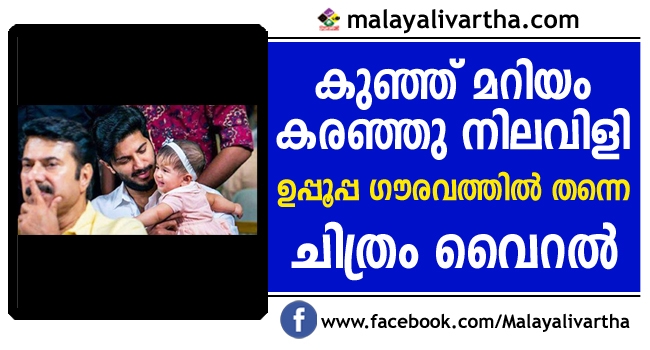 ദുല്ഖറിന്റെ മടിയിലിരുന്ന് കരഞ്ഞു നിലവിളിക്കുകയാണ് കുഞ്ഞു മറിയം. തൊട്ടടുത്ത് ഉമ്മച്ചി അമാല് ഉണ്ടെങ്കിലും മറിയത്തെ ആശ്വസിപ്പിക്കാന് കഴിയുന്നില്ല. മുന് നിരയില് തൊട്ടു മുന്നിലായി ഉപ്പൂപ്പയും ഉണ്ട്. കൊച്ചുമോളുടെ കരച്ചില് കേട്ടിട്ടും ഒന്ന് തിരിഞ്ഞു നോക്കുന്നത് പോലുമില്ല ഉപ്പൂപ്പ! താടിയ്ക്ക് കൈ കൊടുത്ത് ഗൗരവത്തില് ഇരിക്കുകയാണ് മെഗാസ്റ്റാര് ഉപ്പൂപ്പ.