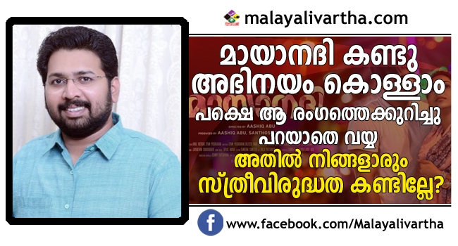 എന്നാല് എന്തുകൊണ്ട് ഇങ്ങനെയുള്ളവരാരും ആഷിക് അബുവിന്റെ മായാനദിയിലെ സ്ത്രീവിരുദ്ധത കണ്ടില്ലേയെന്ന് കെ ശബരീനാഥന് എംഎല്എ. കസബയിലെ ഒരു സീനിനെക്കുറിച്ച് ഉയർത്തിയ വിവാദങ്ങളൊന്നും കെട്ടടങ്ങിയിട്ടില്ല. സിനിമയില് കൂടുതലും സ്ത്രീവിരുദ്ധതയാണെന്ന് ആരോപിച്ച് നടി പാര്വ്വതിയും ഇത് കണ്ടില്ലേ?