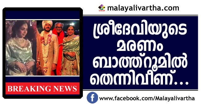 നടി ശ്രീദേവിയുടെ മരണം ബാത്ത് റൂമിൽ തെന്നിവീണ്. ദുബായ് നഗരത്തിലെ എമിറേറ്റ്സ് ടവര് ഹോട്ടലിലെ ബാത്ത് റൂമിലാണ് ശ്രീദേവി തെന്നിവീണത്. റാഷിദിയ ആശുപത്രിയില് എത്തിക്കുന്നതിനു മുമ്പു തന്നെ മരണം സംഭവിച്ചിരുന്നു.പോസ്റ്റു മോര്ട്ടം നടപടികള് പുരോഗമിക്കുന്നു.