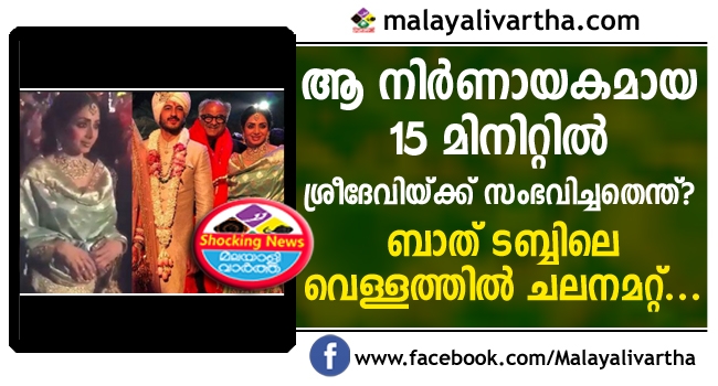 ഉറങ്ങി കിടന്ന ശ്രീദേവിയെ തട്ടി വിളിച്ച് 'സര്പ്രൈസ് ഡിന്നറി'നായി ബോണികപൂർ ക്ഷണിച്ചു; കുളിമുറിയിലേക്ക് കയറിപ്പോയ ശ്രീദേവിയെ ഒടുവിൽ ഭർത്താവ് കണ്ടത് ബാത് ടബ്ബിലെ വെള്ളത്തില് ചലനമറ്റ് മുങ്ങി കിടക്കുന്ന നിലയിൽ...ആ 15 മിനിറ്റിൽ സംഭവിച്ചതെന്ത്? ഞെട്ടിക്കുന്ന റിപ്പോർട്ടുകൾ പുറത്ത്...