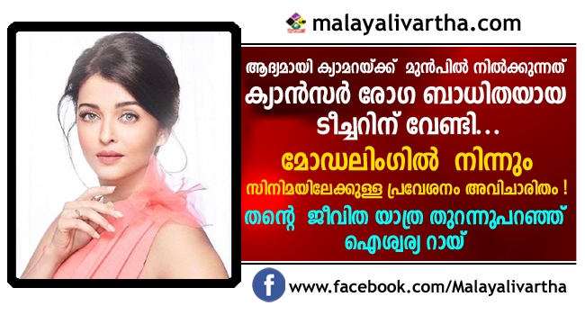 ലോകസുന്ദരി എന്ന് കേൾക്കുമ്പോൾ തന്നെ മനസിലെത്തുന്ന മുഖം ഐശ്വര്യ റായിയുടേതാണ്. എല്ലാ അഴകളവുകളും ഒത്തിണങ്ങിയ ഐശ്വര്യ സിനിമ ലോകത്തെത്തിയിട്ട് 20 വർഷമായി . പല പല സംഭവ വികാസങ്ങളിലൂടെയും കടന്നു പോയ ഐശ്വര്യയുടെജീവിതം തുടങ്ങുന്നത് മോഡലിങ്ങിലാണ്. പലരും കരുത്തും പോലെ സിനിമ ലക്ഷ്യമാക്കി മോഡലിങ്ങിലിറങ്ങിയതല്ല ഐശ്വര്യ. അവർ ആദ്യമായി ക്യാമറയ്ക്ക് മുൻപിൽ നിക്കുന്നത് കാൻസർ രോഗ ബാധിതയായ ടീച്ചറിന് വേണ്ടിയാണ്. ഫെമിനക്ക് നൽകിയ അഭിമുഖത്തിൽ ഐശ്വര്യ തന്റെ ജീവിത യാത്ര പങ്കു വച്ചു.