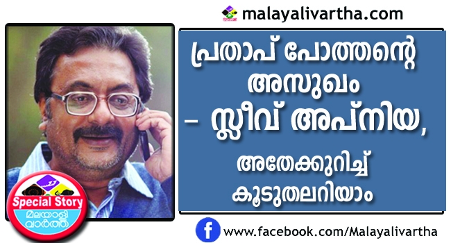 പ്രതാപ് പോത്തന് ആശുപത്രിയിയില്, ഹാര്ട്ട് അറ്റാക്കാണെന്നും മറ്റ് പല രോഗങ്ങളാണെന്നും വാര്ത്തകള് പരന്നു. ഇനി അദ്ദേഹം അഭിനയത്തിലേക്ക് തിരിച്ച് വരില്ലെന്നും കഥകളുണ്ടായി. എന്നാല് അദ്ദേഹം ശക്തനായി തിരിച്ച് വന്നു. തിരിച്ച് വരാമെന്ന് നല്ല ആത്മവിശ്വാസം ഉണ്ടായിരുന്നെന്ന് അദ്ദേഹം പറഞ്ഞു. ഒരു ലണ്ടണ് യാത്രയ്ക്കിടെയാണ് പ്രതാപ്പോത്തന് രോഗലക്ഷണങ്ങള് കണ്ട് തുടങ്ങിയത്. ധാരാളം യാത്ര ചെയ്യുന്നയാളാണ് പ്രതാപ് പോത്തന്. അതുകൊണ്ട് ഉറക്കവും കുറവ്. അസുഖം കൂടിയപ്പോള് അവിടെയുള്ള ഒരു ആശുപത്രിയില് ചികില്സതേടി. സ്ലീവ് അപ്നിയയാണെന്ന് ഡോക്ടര്മാര് അറിയിച്ചു. ഹാമോഗ്ലോബിന്റെ അളവ് രക്തത്തില് കുറയുന്നത് കാരണമുണ്ടാകുന്ന അസുഖമാണ്. മാത്രമല്ല താരം അനീമിക്കും ആയിരുന്നു. പൂര്ണവിശ്രമം വേണമെന്ന് ഡോക്ടര്മാര് നിര്ദ്ദേശിച്ചു.