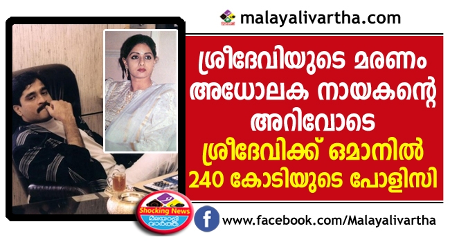 ശ്രീദേവിയുടെ അന്ത്യ നിമിഷങ്ങൾ അധോലോക നായകൻ ദാവൂദ് ഇബ്രാഹിമിന്റെ ഉടമസ്ഥതയിലുള്ള ജുമേറ എമിറേറ്റ്സ് ടവറിൽ; ഒമാനില് ശ്രീദേവിയ്ക്ക് 240 കോടി രൂപയുടെ ഇന്ഷുറന്സ് പോളിസി: ശ്രീദേവിയുടേത് വെറുമൊരു മുങ്ങിമരണമല്ലെന്ന് സ്ഥിരീകരിക്കുന്ന റിപ്പോർട്ടുകൾ പുറത്ത്