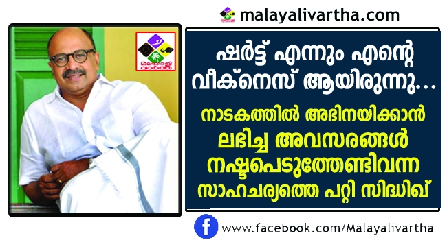 വളരെയധികം അവസരങ്ങൾ ലഭിച്ചിട്ടും ഇതുവരെയും നാടകത്തിൽ അഭിനയിക്കാത്തതിനു പിന്നിലെ കാരണം വെളിപ്പെടുത്തി നടൻ സിദ്ധിഖ്. ഷര്ട്ടില്ലാതെ ഒരു സീനില് പോലും അഭിനയിക്കാന് തനിക്കാക്കാകാത്തതാണ് ഇതിനു കാരണമെന്ന് സിദ്ധിഖ് പറഞ്ഞു.