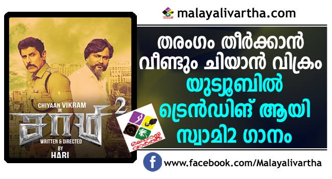 വിക്രമും കീര്ത്തി സുരേഷും പ്രധാന വേഷത്തിലെത്തുന്ന സാമി 2ന്റെ ഗാനം യുട്യൂബിൽ സൂപ്പർ ഹിറ്റ്. 15 കൊല്ലങ്ങൾക്ക് ശേഷം സാമി എന്ന ബ്ലോക്ക്ബസ്റ്റർ പടത്തിന്റെ രണ്ടാം ഭാഗം സ്വാമി സ്ക്വൊയറിൽ യുട്യൂബിൽ ട്രെൻഡിങ് ആയ ഈ ഗാനത്തിൽ അഭിനയിച്ചിരിക്കുന്നത് ചിയാൻ വിക്രമും കീർത്തി സുരേഷുമാണ്.അവർ തന്നെയാണ് പുതു മെട്രോ റയിൽ എന്ന ഗാനം ആലപിച്ചിരിക്കുന്നത്. സംഗീതം ദേവി ശ്രീ പ്രസാദാണ്.