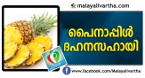 ദഹന പ്രക്രിയയ്ക്ക് സഹായകമാകുന്നു എന്നത് പൈനാപ്പിളിന്റെ ഗുണമാണ്. ഇതില് അടങ്ങിയിരിക്കുന്ന ബ്രോമെലയ്ന് എന്ന എന്സൈം ദഹനക്കേട് അകറ്റാന് സഹായിക്കുകയും ചുമ, കഫം എന്നിവ അകറ്റുകയും ചെയ്യും. ദഹന പ്രക്രിയ...