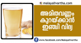 അമിതവണ്ണം കുറയ്ക്കാന് വളരെ നല്ലതാണ് ഇഞ്ചി. ഒരു ഗ്ലാസ് ചെറുചൂടുവെള്ളത്തില് അല്പം ഇഞ്ചി നീരും, തേനും ചേര്ത്ത് കഴിക്കുന്നത് തടി കുറയ്ക്കാന് സഹായിക്കുന്നു. ഉദരസംബന്ധമായ അസുഖങ്ങള് അകറ്റാനും ഇഞ്ചി കഴി...