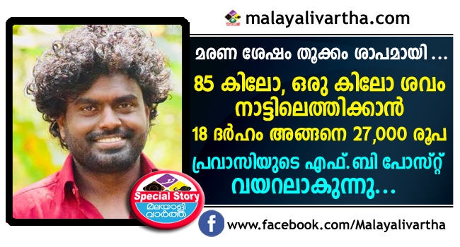 ഒരു കിലോ ശവം നാട്ടില് എത്തിക്കാന് 18 ദിര്ഹം ... മൊത്തം 1530 ദിര്ഹം ..... ഏതാണ്ട് ഇരുപത്തിഏഴായിരം രൂപ ചിലവാക്കി എന്നെ ആരൊക്കയോ കയറ്റി അയച്ചു... പ്രവാസിയുടെ എഫ്.ബി പോസ്റ്റ് ചര്ച്ചയാകുന്നു