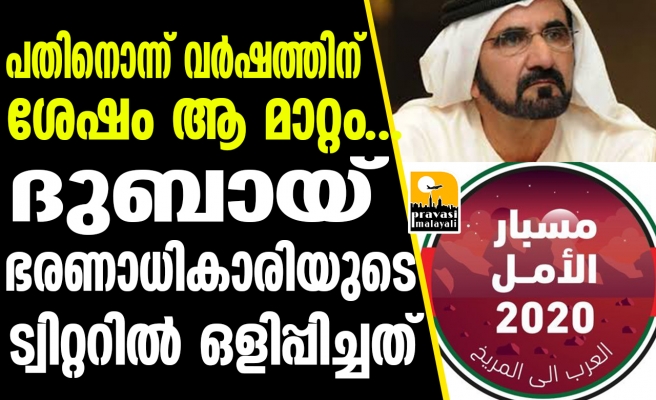 ലക്ഷക്കണക്കിന് ആളുകൾ പിന്തുടരുന്ന തന്റെ ട്വിറ്റർ പേജിന്റെ പ്രൊഫൈൽ ഫോട്ടോ യു.എ.ഇ. വൈസ് പ്രസിഡന്റും പ്രധാനമന്ത്രിയും ദുബായ് ഭരണാധികാരിയുമായ ശൈഖ് മുഹമ്മദ് ബിൻ റാഷിദ് അൽ മക്തൂം വെള്ളിയാഴ്ച മാറ്റിയത് അംബരപ്പോടെയാണ് ലോകം കാണുന്നത്. എന്തെന്നാൽ ട്വിറ്റർ അക്കൗണ്ട് തുടങ്ങി പതിനൊന്നുവർഷത്തിനുശേഷം ആദ്യമായാണ് ഇത്തരമൊരു നടപടി എന്നതാണ്.