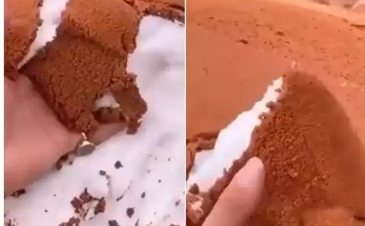 വിഡിയോയിൽ മണലിൽ മഞ്ഞ് വീണുകിടക്കുന്നത് കാണാം. കെെകൊണ്ട് മണൽമാറ്റിയപ്പോൾ അകത്ത് നിറയെ മഞ്ഞ് ഇതാണ് വീഡിയോയിൽ കാണുന്നത്. സൗദിയിലെ തബൂക് പ്രദേശത്ത് കഴിഞ്ഞ ദിവസം വലിയ രീതിയിൽ മഞ്ഞ് വീഴ്ച ഉണ്ടായതായി ഗള്ഫ് ന്യൂസ് റിപ്പോർട്ട് ചെയ്തിരുന്നു. ഇത് പല വിസ്മയ കാഴ്ചകളാണ് സമ്മാനിച്ചത്. ഇപ്പോഴിതാ വീഡിയോക്ക് താഴെ നിരവധി പേരാണ് കമന്റുമായി എത്തിയിരിക്കുന്നത്. ചോക്കോബാര് പോലെയുണ്ട്. ഇത് എന്താ ചോക്കലേറ്റ് കേക്ക് ആണോ എന്നെല്ലാം ആണ് കമന്റുകൾ എത്തുന്നത്.
