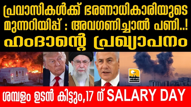 യുദ്ധമുഖത്ത് നിൽക്കുന്ന യുഎഇയിൽ സർക്കാരിന്റെ ആശ്വാസ പ്രഖ്യാപനം. സർക്കാർ ജീവനക്കാർക്ക് ശമ്പളം നേരത്തെ നൽകാൻ ദുബായ് കിരീടവകാശി ശൈഖ് ഹംദാൻ ഉത്തരവിട്ടു. ചെറിയ പെരുന്നാൾ പ്രമാണിച്ചാണ് പുതിയ ഉത്തരവ്. എല്ലാ സർക്കാർ ഉദ്യോഗസ്ഥർക്കും ദുബായിൽ മാർച്ച് 17ന് ശമ്പളം ബാങ്ക് അക്കൗണ്ടിലെത്തും.