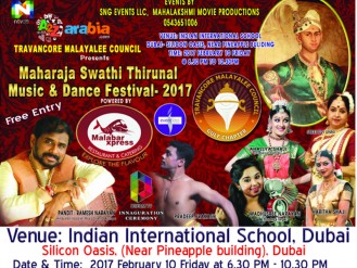 തിരുവിതാംകൂര് ചരിത്രത്തില് യുഗപ്രഭാവനായി പ്രശോഭിക്കുന്ന സ്വാതി തിരുനാള് മഹാരാജാവിന്റെ സ്മരണാര്ത്ഥം തിരുവിതാംകൂര് മലയാളി കൗണ്സില്, എസ്. എന്. ജി ഈവന്റസ് ദുബായ്, മഹാലക്ഷ്മി മൂവി പ്രൊഡക്ഷന്സ്, മലബാര് എക്സ്പ്രസ്സ് , എ.ടു.ഇസഡ് അറേബ്യ. കോം എന്നിവര് സംയുക്തമായി സംഘടിപ്പിക്കുന്ന ' മഹാരാജാ സ്വാതി തിരുനാള് മ്യൂസിക് & ഡാന്സ് ഫെസ്റ്റിവല്' ഫെബ്രുവരി 10 വെള്ളി 6.30 പി.എം ന് ദുബായ് സിലിക്കോണ് ഒയാസിസിലുള്ള ഇന്ഡൃന് ഇന്റര്നാഷണല് സ് കൂളില് ആരംഭിക്കും. പ്രവേശനം സൗജന്യമാണ്.