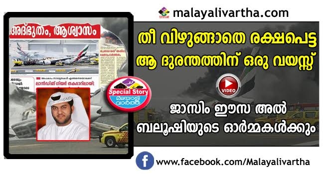 തിരുവനന്തപുരം–ദുബായ് എമിറേറ്റ്സ് വിമാന അപകടത്തിന് ഇന്ന് ഒരുവയസ്സ്. കഴിഞ്ഞവര്ഷം ഓഗസ്റ്റ് മൂന്നിന് പ്രാദേശികസമയം 12.45ന് ലാന്ഡിങ്ങിനിടെ ഇടിച്ചിറങ്ങിയ വിമാനം, യാത്രക്കാരെ രക്ഷപ്പെടുത്തി നിമിഷങ്ങള്ക്കകം ഉഗ്രശബ്ദത്തോടെ അഗ്നിഗോളമായി മാറുകയായിരുന്നു. വിമാനത്തിന്റെ അടുത്തുനിന്ന് അതിവേഗം ദൂരേക്ക് ഓടിമാറാന് വിളിച്ചു പറഞ്ഞ് യാത്രക്കാരെ രക്ഷിക്കാനുള്ള ശ്രമത്തിനിടെയാണ് ജാസിം ഈസ അല് ബലൂഷി കൊല്ലപ്പെട്ടത്. അദ്ദേഹത്തിന്റെ സ്വന്തം ജീവന് വകവെക്കാതുള്ള പ്രവര്ത്തിയാണ് അന്ന് ദുരന്തത്തിന്റെ വ്യാപ്തി കുറച്ചത്. ജാസിം ഈസ അല് ബലൂഷിയുടെ വിയോഗം രാജ്യത്തിന്റെയും യാത്രക്കാരുടെയും തീരാദുഃഖമായി ഇന്നും അവശേഷിക്കുന്നു.