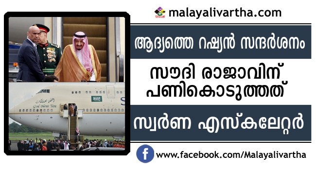 സ്വര്ണം കൊണ്ടുണ്ടാക്കിയാതാണെന്ന് പറഞ്ഞിട്ടെന്താ എസ്കലേറ്റര് പണിമുടക്കിയതുകൊണ്ട് വഴി മുടങ്ങിയത് നിസാരക്കാരനല്ല സാക്ഷാല് സൗദി രാജാവിനാണ്. മോസ്കോയിൽ സൽമാൻ രാജാവ് വിമാനമിറങ്ങിയതു മുതൽ അൽഭുത കാഴ്ചകളാണ്. വിമാനത്തിൽ നിന്ന് രാജാവ് ഇറങ്ങിയത് സ്വർണ്ണത്തിൽ തീർത്ത എ്സ്കലേറ്റളിലാണ്. ഒപ്പം പ്രത്യേക കാർപ്പറ്റും കൊണ്ടു വന്നു. ഇതിലൂടെയാണ് രാജാവിന്റെ നടത്തം. ആദ്യമായാണ് റഷ്യൻ സന്ദർശനത്തിന് സൗദി രാജാവെത്തുന്നത്.