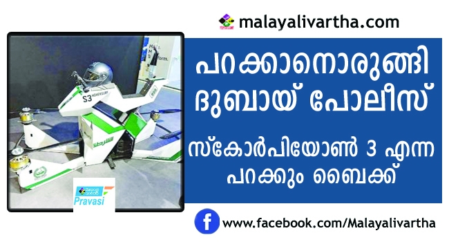 2017 ജികെക്സ് ടെക്നിക്കല് ഷോയിൽ പറക്കുന്ന ബൈക്ക് പ്രദർശിപ്പിച്ചു ഏവരെയും അതിശയിപ്പിച്ചിരിക്കുകയാണ് ദുബായ് പൊലീസ്. ഹോവര് സര്ഫര് എന്ന റഷ്യന് കമ്പനിയാണ് ഡ്രോണിന്റെ മാതൃകയില് പ്രവര്ത്തിക്കുന്ന പറക്കും ബൈക്ക് നിർമിച്ചിരിക്കുന്നത്. സ്കോർപിയോൺ 3 എന്നാണ് ഈ മാന്ത്രിക ബൈക്കിനു നാമകരണം ചെയ്തിരിക്കുന്നത്. ഇതിനു ഒരാളെ വഹിച്ചുകൊണ്ട് 5 മീറ്റര് വരെ ഉയരത്തില് 25 മിനിറ്റു വരെ ഒറ്റ സ്റ്റെപ്പിൽ പറക്കാനാകും.