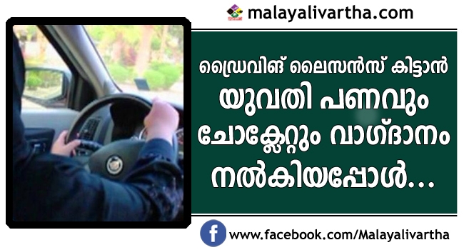 ഡ്രൈവിങ് ലൈസന്സ് കിട്ടാൻ യുവതി ഉദ്യോഗസ്ഥർക്ക് പണവും ചോക്ലേറ്റും ; യുവതി കുടുങ്ങി