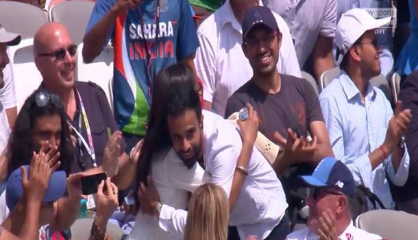 ലോര്ഡ്സ് ക്രിക്കറ്റ് സ്റ്റേഡി നടന്ന ഇന്ത്യ ഇംഗ്ലണ്ട് രണ്ടാം ഏകദിന മത്സരം രണ്ടു ഹൃദയങ്ങളെ ഒരുമിപ്പിക്കുന്നതിന് കൂടി സാക്ഷിയായി. മത്സരം നടക്കുന്നതിനിടെ ഒരു യുവാവ് തന്റെ സമീപത്തിരുന്ന് കളികണ്ട്കൊണ്ടിരിക്കുകയായിരുന്ന പെണ് സുഹൃത്തിനോട് വിവാഹഭ്യാര്ഥന നടത്തുകയായിരുന്നു. ഉടന്തന്നെ പെണ്സുഹൃത്ത് അഭ്യാര്ത്ഥന സ്വീകരിക്കുകയും ചെയ്തു.