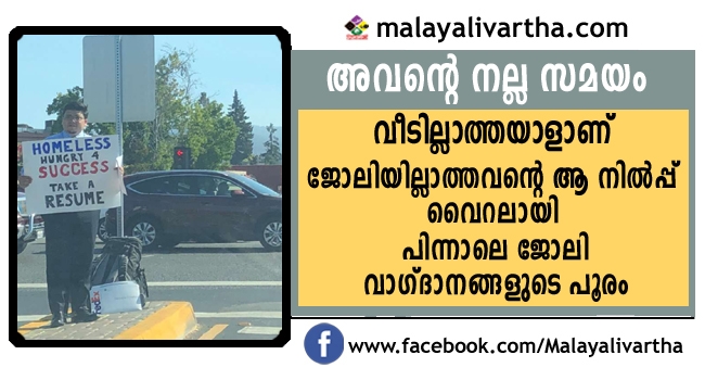 അവന്റെ നല്ല സമയം അല്ലാണ്ടെന്തുപറയണം. വീടില്ലാത്തയാളാണ്...വിജയത്തിനു വേണ്ടി കൊതിക്കുകയാണ്...ഒരു റെസ്യൂമെ സ്വീകരിക്കൂ ഇങ്ങനെയെഴുതിയ ഒരു കുറിപ്പും കയ്യില്പ്പിടിച്ച് കാലിഫോര്ണിയയിലെ റോഡരികില് ഒരു മനുഷ്യന്. അയാളും അയാളുടെ നില്പും കുറിപ്പും വൈറലായതോടെ ഗൂഗിളില്നിന്ന് വരെ ജോലി ഓഫറുകളുടെ പെരുമഴയാണ്.