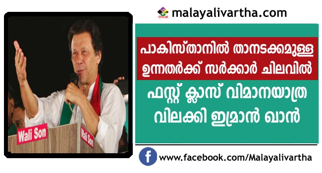 പാകിസ്താന്റെ ഭരണ സിരാകേന്ദ്രങ്ങളിലിരിക്കുന്ന താനടക്കമുള്ള ഉന്നതര് സര്ക്കാര് ചിലവില് ഫസ്റ്റ് ക്ലാസ് വിമാനയാത്ര നടത്തുന്നതിന് പ്രധാനമന്ത്രി ഇമ്രാന് ഖാന്റെ വിലക്ക്. പ്രധാനമന്ത്രിക്ക് പുറമെ പ്രസിഡന്റ്, സുപ്രീംകോടതി ചീഫ് ജസ്റ്റിസ്, അസംബ്ലി സ്പീക്കര് എന്നിവര് അടക്കമുള്ളവര്ക്കാണ് വിലക്ക്.