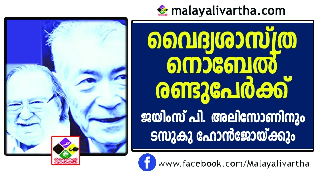 വൈദ്യശാസ്ത്ര നൊബേല് പുരസ്കാരം ജെയിംസ് പി അലിസണും ജപ്പാനിലെ ടസാകു ഹോന്ജോക്കും