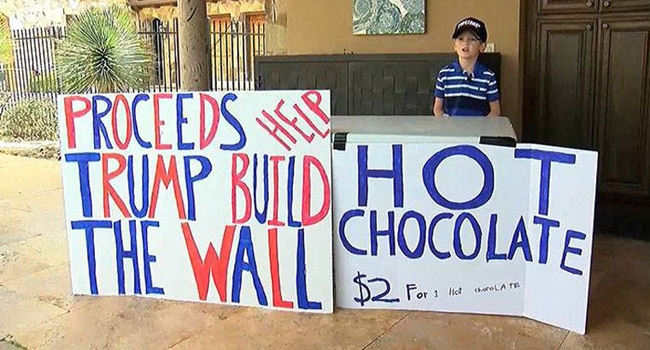 അതിർത്തിയിൽ മതിൽ പണിയണമെന്ന ട്രംപിന്റെ ലക്ഷ്യം നിറവേറാൻ സംഭാവനയുമായി ഏഴ് വയസ്സുകാരൻ; ഹോട്ട് ചോക്ലറ്റ് വിറ്റ് നേടിയത് ലക്ഷങ്ങൾ