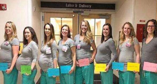 പോര്ട്ട്ലാന്ഡിലെ മെയ്നെ മെഡിക്കല് സെന്ററിൽ പ്രവസവവാര്ഡില് ജോലി ചെയ്യുന്നത് ഗർഭിണികൾ തന്നെ. ഗര്ഭിണികള് തന്നെ ജോലി ചെയ്തത്. ഒന്പത് ഗര്ഭിണികളായ നഴ്സുന്മാരാണ് പ്രസവ വാര്ഡില് ജോലി ചെയ്യുന്നത്. ഈ നഴ്സുമാരില് എട്ടുപേരും ആശുപത്രിയിലെ പ്രസവ വാര്ഡിനു മുന്നില് നില്ക്കുന്ന ചിത്രം ഇവരില് ഒരാളായ ബ്രിറ്റെനി വെര്വില്ലെ ഫേസ്ബുക്കില് പോസ്റ്റു ചെയ്തതോടെയാണ് ഈ കൗതുകകരമായ വാര്ത്ത പുറംലോകം അറിയുന്നത്.