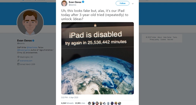 ന്യൂയോര്ക്കര് മാഗസിനിലെ ലേഖകനായ ഇവാന് ഓസ്നാസ് ആണ് തനിക്ക് മുട്ടന്പണി കിട്ടിയ വിവരം ട്വിറ്ററിലൂടെ പങ്കുവച്ചത്. ഐ പാഡില് തെളിയുന്നതു പ്രകാരമുള്ള നിമിഷങ്ങള്ക്ക് ശേഷമേ ഇനി തുറക്കാനാവൂ, അത് 25,536,442 മിനിറ്റുകള്ക്ക് ആണെന്ന് മാത്രം. ചുരുക്കം പറഞ്ഞാല് 50 വര്ഷം കഴിയാതെ ഐപാഡ് ഓപ്പണ് ചെയ്യാന് പറ്റില്ല എന്ന് സാരം. തുറക്കാന് ഏന്തങ്കിലും മാര്ഗമറിയുമോ എന്നാരാഞ്ഞാണ് ഇവാന് ട്വീറ്റ് ചെയ്തിരിക്കുന്നത്.