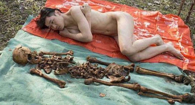 അച്ഛന്റെ അസ്ഥിക്കൂടങ്ങള്ക്കരികില് പൂർണ നഗ്നനായി കിടന്ന് മകന്റെ ഫോട്ടോഷൂട്ട്