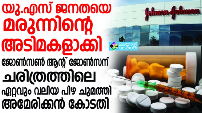 യുഎസ് ജനതയെ മയക്കുമരുന്നിന്റെ അംശമുള്ള വേദനസംഹാരികളുടെ വിപണനത്തിലൂടെ അടിമകളാക്കി മാറ്റിയ ജോൺസൺ ആന്റ് ജോൺസന് ഭീമമായ തുക പിഴ ചുമത്തി അമേരിക്കൻ കോടതി