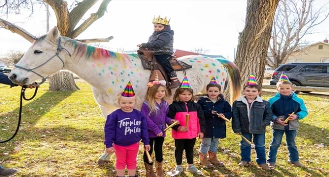 തന്റെ ഫാമിലെ ഒരു കുതിരക്കുട്ടിയേയും നീല്സണ് കൊണ്ടുവന്നിരുന്നു. ആ വെള്ളക്കുതിരയെ നിറങ്ങളില് കുളിപ്പിച്ച് നെറ്റിയില് ഒരു കൊമ്പ് വച്ചുപിടിപ്പിച്ച് വ്യാട്ടിന്റെ ഇഷ്ട കഥാപാത്രമായ യൂണികോണ് (കുതിരയ്ക്ക് സമാനമായതും ഒറ്റകൊമ്പുള്ളതുമായ മൃഗം) പോലെയാക്കി ത്തീര്ത്തു. ഡിസംബര് ഏഴിന് പ്രദേശത്തെ ഒരു പാര്ക്കില് വച്ച് പാര്ട്ടി നടന്നു. വ്യാട്ടിന് സമ്മാനമായി യൂണികോണ് രൂപത്തിലുള്ള കളിപ്പാട്ടങ്ങളുമായാണ് സഹപാഠികള് എത്തിയത്.