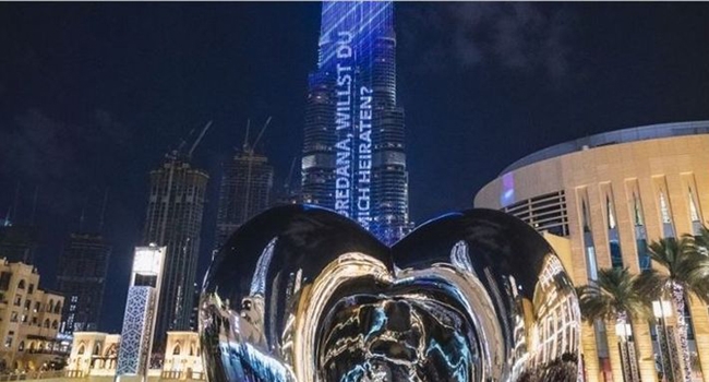 പുതുവര്ഷത്തെ വരവേല്ക്കുന്നതിനുള്ള വെടിക്കെട്ടും ലേസര് ഷോയും തുടങ്ങുന്നതിന് തൊട്ട് മുമ്പ് ആണ് ബുര്ജ് ഖലീഫയിൽ പ്രണയാഭ്യർത്ഥന തെളിഞ്ഞു വന്നത്. ജര്മന് പൗരനായ സെര്ജെ ഷാന്ഡറാണ് തന്റെ പ്രണയിനിക്കായി ലോകത്തെ മുഴുവൻ ഞെട്ടിച്ചുകൊണ്ട് ലോകത്തിലെ ഏറ്റവും വലിയ കെട്ടിടത്തില് അപ്രതീക്ഷിത പുതുവർഷ സമ്മാനം ഒരുക്കിയത്.
