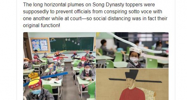 തലയ്ക്കു മുകളിൽ തൊപ്പിപോലെ ധരിക്കാവുന്ന ഗിയറുകൾ ആണ് ഉപയോഗപ്പെടുത്തിയിരിക്കുന്നത്. ഇവയുടെ നീളക്കൂടുതൽ കാരണം വിദ്യാർഥികൾ അടുത്തിരിക്കാൻ സാധിക്കില്ല എന്നതാണ് ഇതിന്റെ പ്രത്യേകത. ഒരു മീറ്റർ അകലം ഉറപ്പുവരുത്തുന്നവയാണ് ഇവ. ചൈനയിലെ ഹാങ്ഷൗവിലെ സ്കൂളിൽ നിന്നുള്ള ചിത്രങ്ങൾ എയ്ലീന ചെങ്യിൻ എന്ന ട്വിറ്റർ ഉപഭോക്താവാണ് തന്റെ അക്കൗണ്ട് വഴി പങ്കുവെച്ചിരിക്കുന്നത്. എന്നാൽ തന്നെയും ചൈനയിലെ പുരാതന സോഹ് രാജവംശകാലത്ത് ഉദ്യോസ്ഥർ ഗൂഢാലോചന നടത്തുന്നത് തടയാനായി രാജാവ് ഏർപ്പെടുത്തിയ തലപ്പാവ് മാതൃകയാണ് ഇവരും പിന്തുടർന്നിരിക്കുന്നതെന്ന് ചിത്രത്തിനൊപ്പം കുറിച്ചിരിക്കുന്നു.